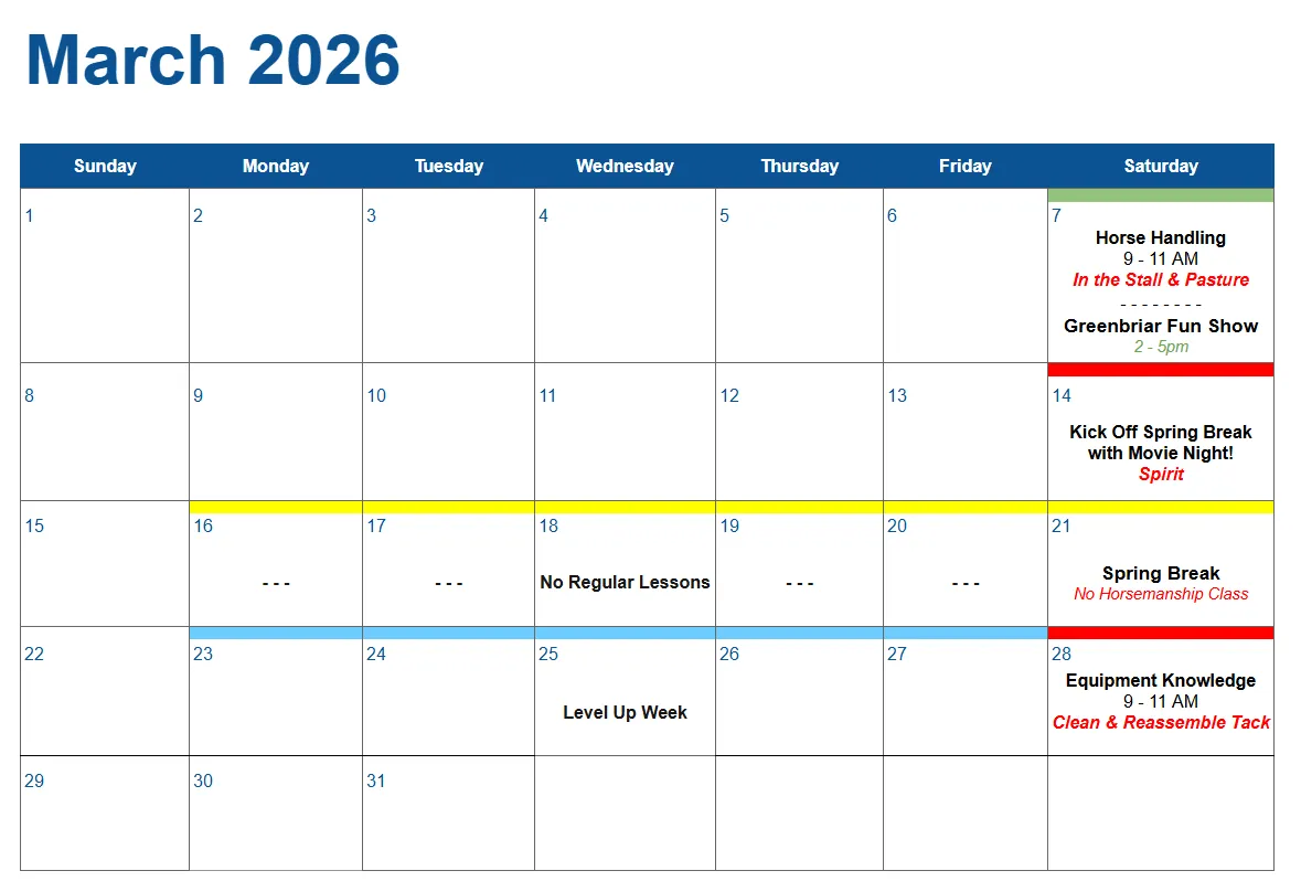 Spring Break: There will be no lessons or Horsemanship during the week of Spring Break, March 16-21. Our horses will enjoy their time off and we hope that you do the same! Lessons will resume March 23rd!